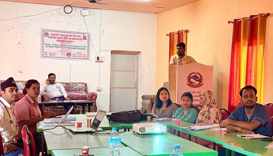 प्रसूति रोग विशेषज्ञ डा. सचिन यादवले प्रसवकालीन स्याहार तथा लेबर केयर गाइड कार्यान्वयनसँग सम्बन्धित संवेदनशीलता, जटिलता, सहजता र चुनौतीलगायतका मुख्य पक्षहरू समेटिएको कार्यपत्र प्रस्तुत गर्नुभएको थियो। अभिमुखिकरणका अध्यक्षता गरेका अस्पतालका निमित मेसु रामप्रकाश साहले यस्ता कार्यक्रमले स्वास्थ्यकर्मीहरूको क्षमता अभिवृद्धि भई सेवा प्रवाहमा सुधार आउने विश्वास व्यक्त गर्नुभयो ।